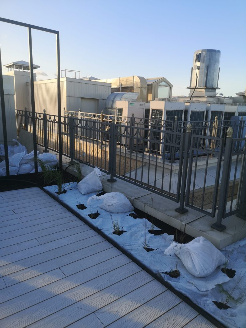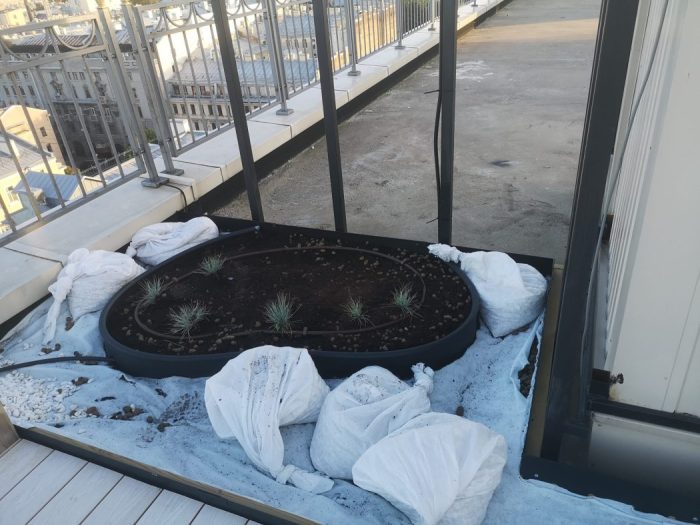 Утепление кашпо, прокладка дренажа и ливневой канализации, укладка керамзита, грунта. Посадка растений, устройство автополива.